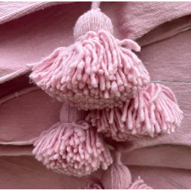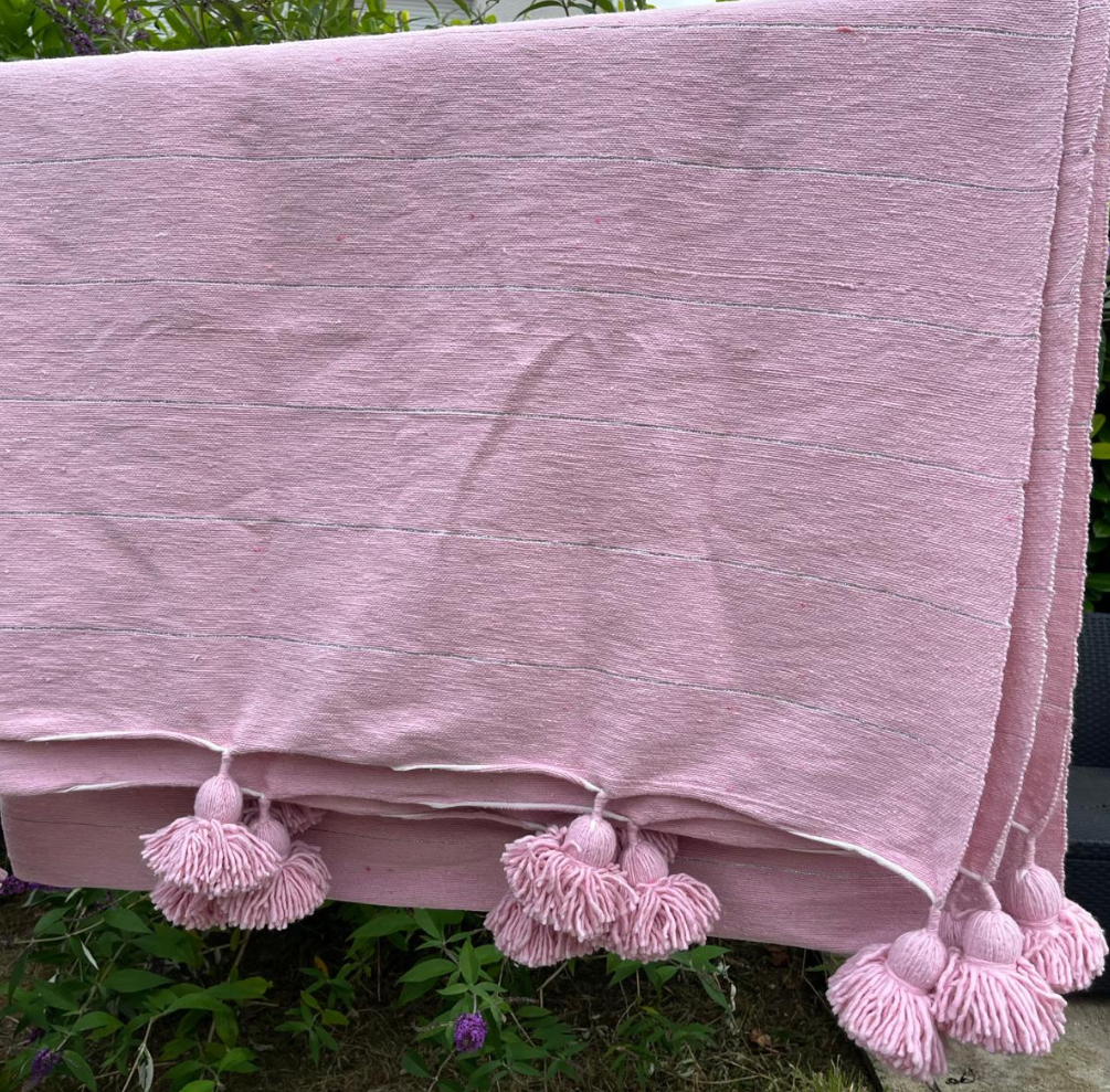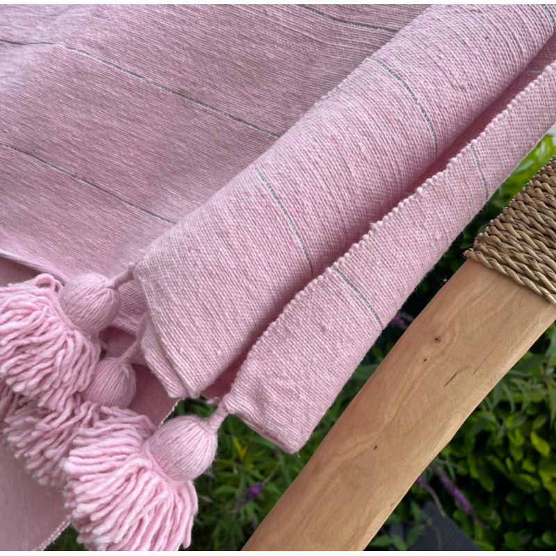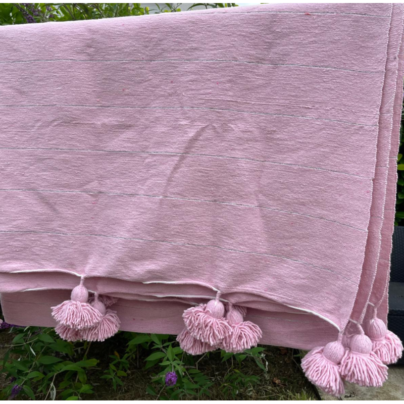 Apportez confort et style à votre maison avec cette couverture en laine rose, ornée de pompons. Parfaite pour les soirées fraîches ou comme élément décoratif sur un canapé ou un lit, cette couverture combine douceur et élégance.
