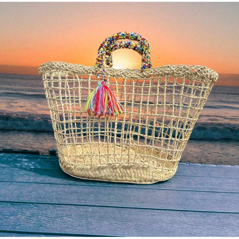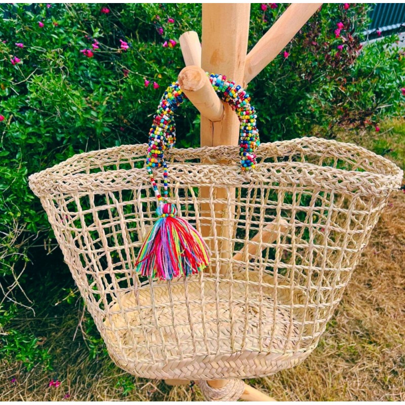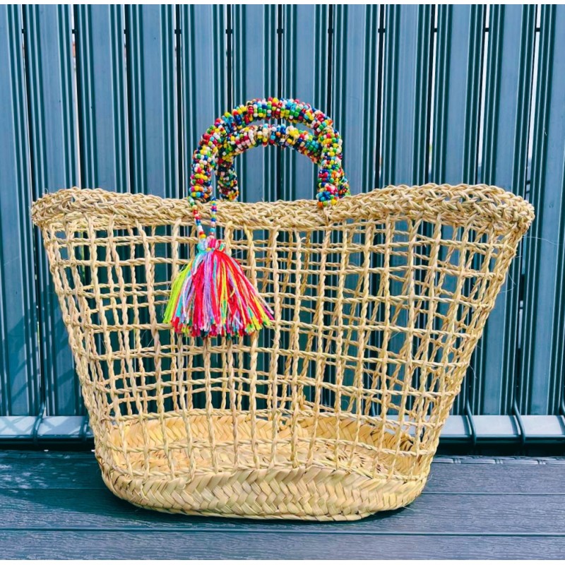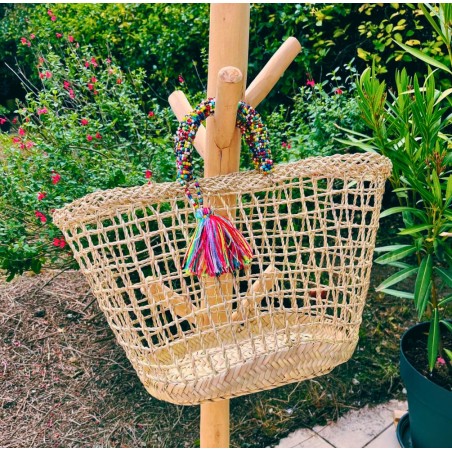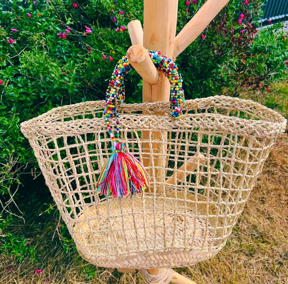 Panier artisanal en palmier naturel, fabriqué et brodé à la main à Marrakech.