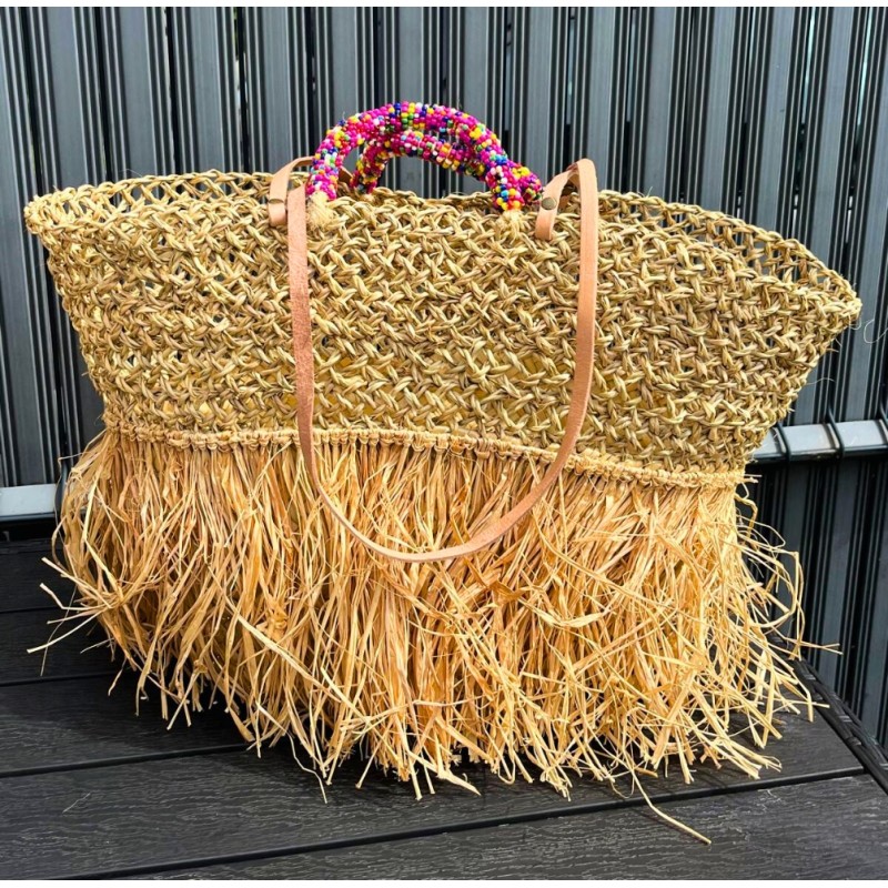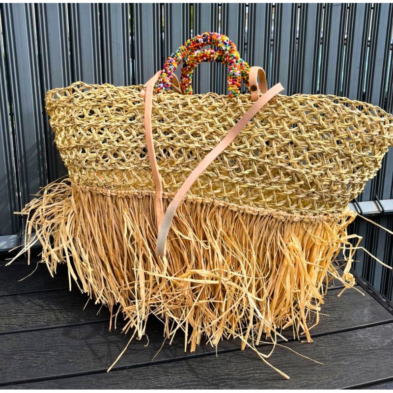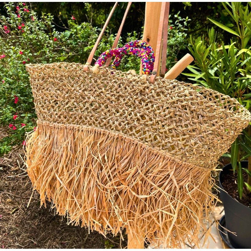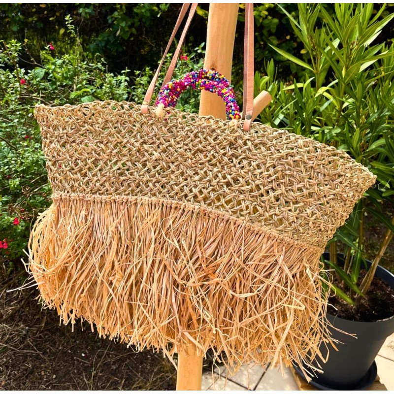 - Matériau : Palmier naturel, franges en paille et anses perlées