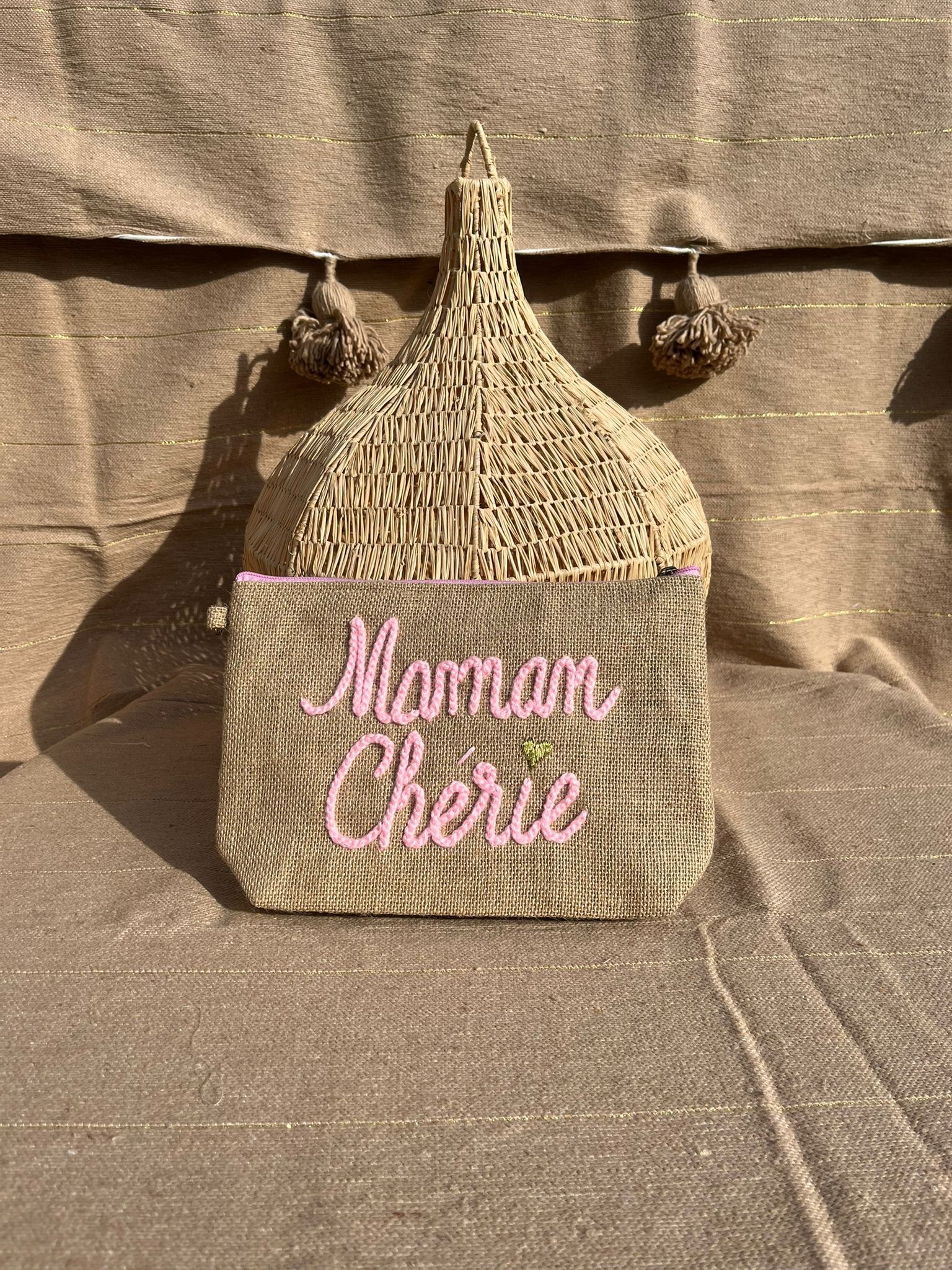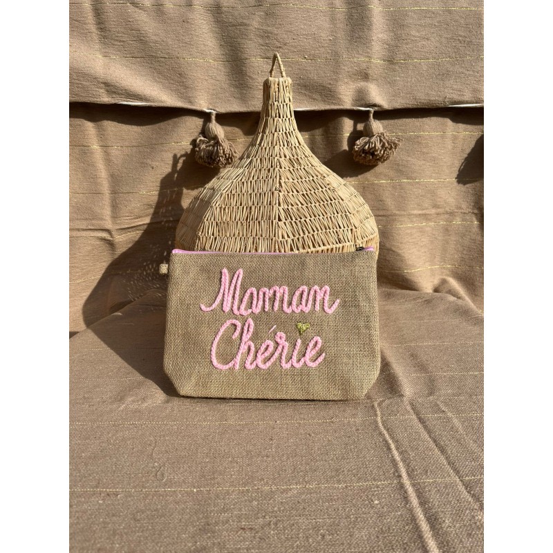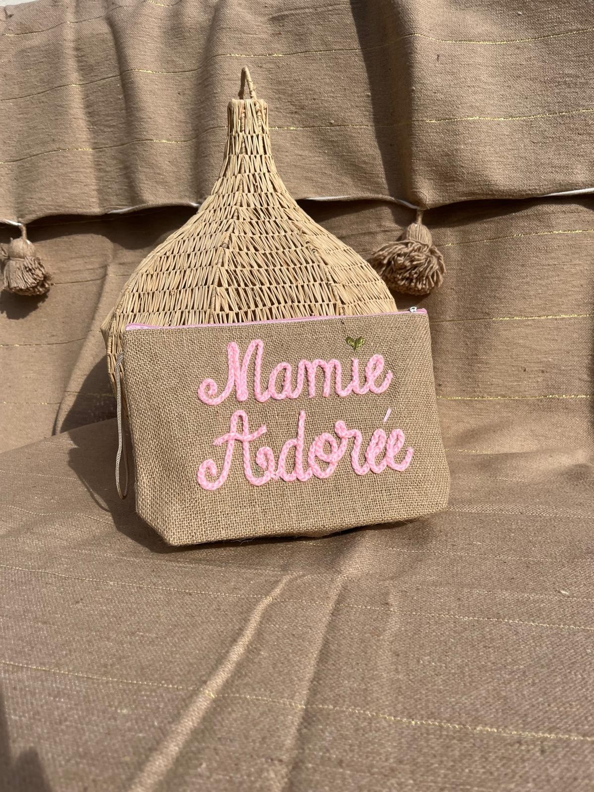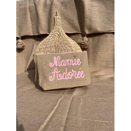 Une petite attention pleine de tendresse ! Cette pochette en lin naturel, brodée “Mamie Adorée” en fil rose poudré, est idéale pour offrir un mot doux ou garder ses essentiels à portée de main.
