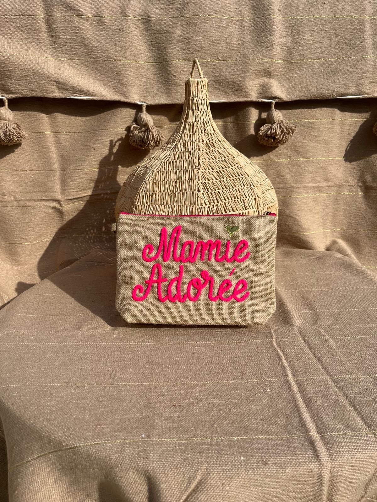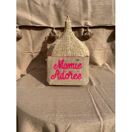 Une pochette pleine de douceur pour une mamie précieuse. Brodée en rose fuchsia sur une toile de lin naturelle, elle allie style et utilité pour un cadeau du cœur.