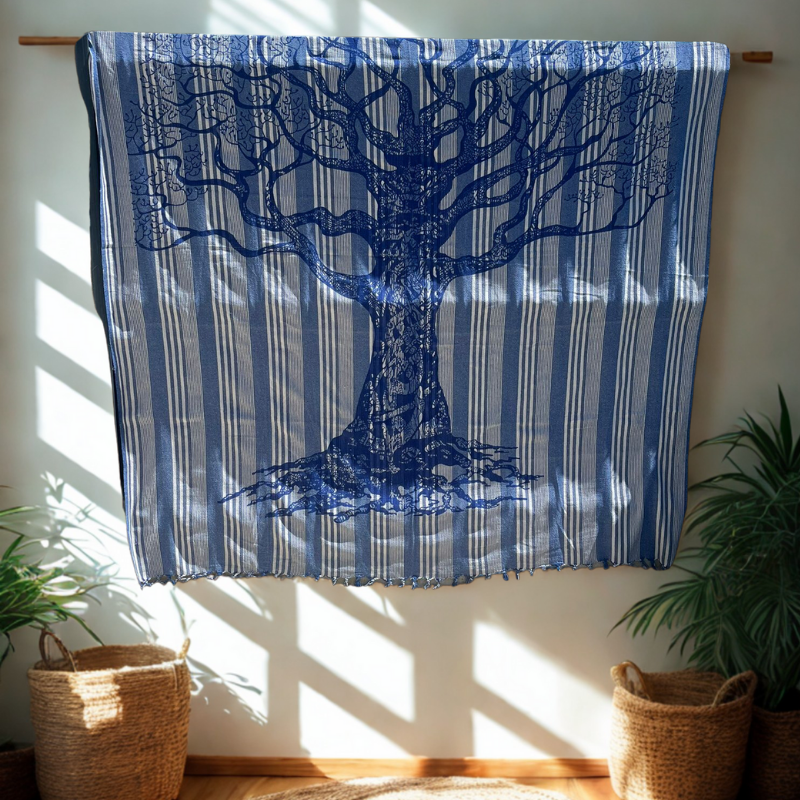 Plongez dans une ambiance paisible et symbolique avec cette tenture représentant un arbre de vie majestueux. Son imprimé bleu indigo se détache magnifiquement sur un fond rayé naturel pour une déco zen et authentique.