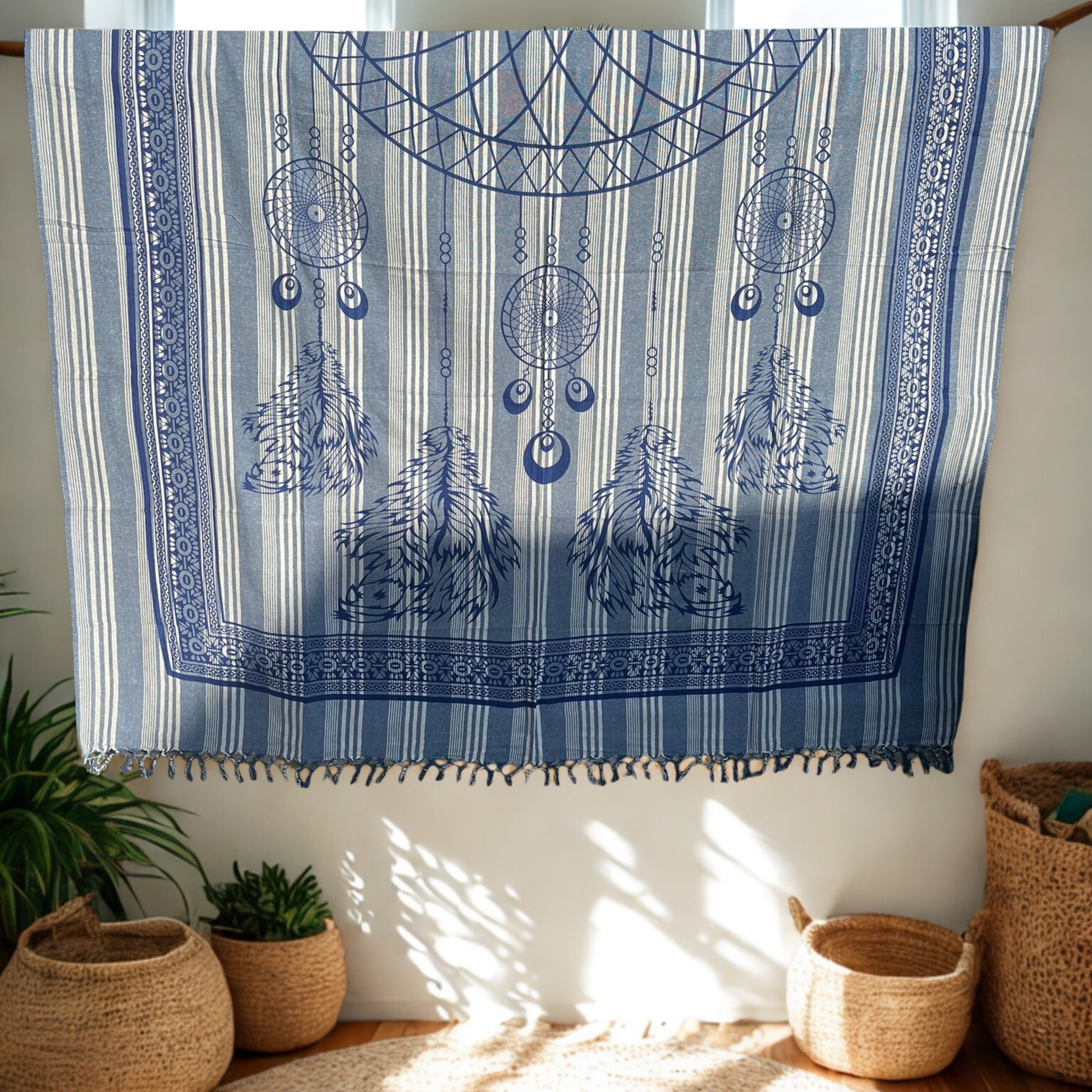 Créez une ambiance apaisante avec cette tenture murale en coton aux motifs attrape-rêves et plumes, sur fond rayé bleu et beige. Un must-have pour une déco bohème chic et symbolique.