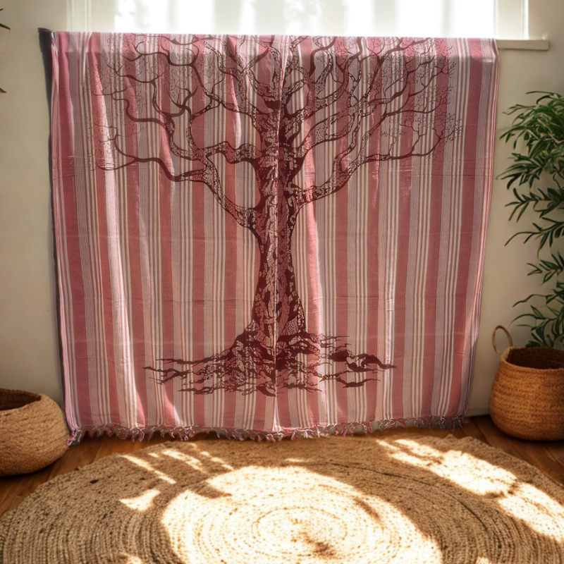 Offrez à votre intérieur une atmosphère apaisante et symbolique avec cette tenture en coton rayé ornée d’un arbre de vie. Son design raffiné et ses couleurs douces apportent une touche bohème et naturelle.
