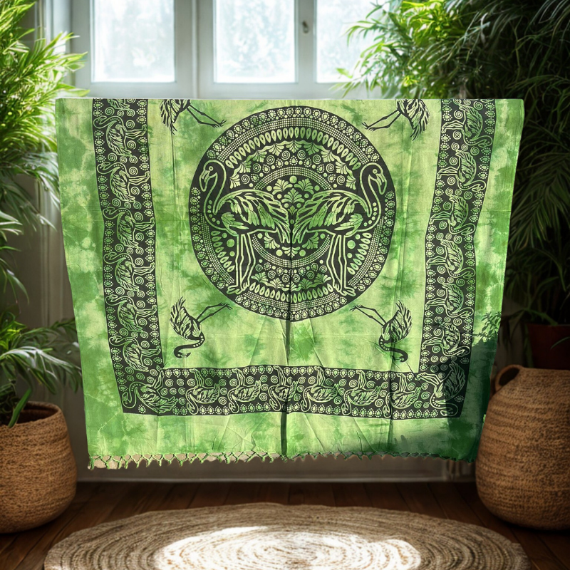Apportez une ambiance zen et tropicale à votre intérieur avec cette tenture murale en coton vert émeraude, ornée d’un mandala flamants noirs et de motifs ethniques. Parfaite en déco murale, dessus de lit, nappe ou même rideau léger.